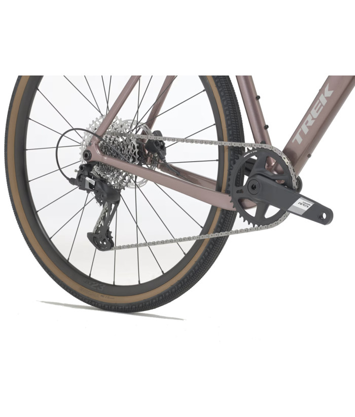Un cadre en aluminium Alpha de la série 300 avec un cadre entièrement en carbone Fourche, avec dégagement pour des pneus jusqu’à 50 mm. Changement de vitesse SRAM Apex XPLR à 12 vitesses amélioré, freins à disque hydrauliques, roues Bontrager Paradigm avec pneus Bontrager Girona Pro Tubeless Ready, ainsi que supports pour charger avec des sacs, des porte-bagages et du matériel.