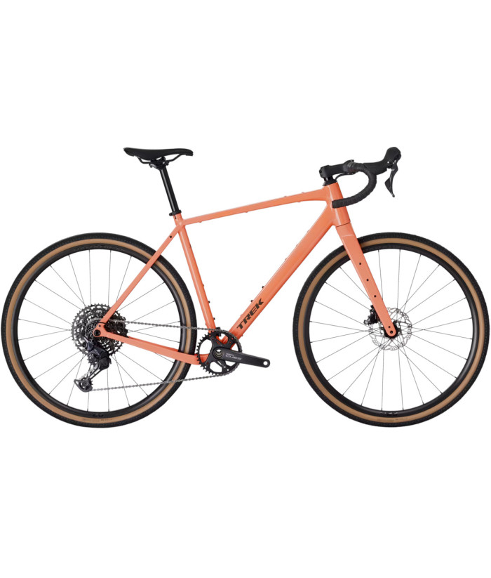 Un cadre en Alpha Aluminum série 300 avec une fourche entièrement en carbone, offrant un dégagement pour des pneus jusqu’à 50 mm. Transmission Shimano CUES U8000 à 11 vitesses, freins à disque hydrauliques, roues Bontrager Paradigm avec pneus Bontrager Girona Pro Tubeless Ready, ainsi que des fixations pour sacoches, porte-bagages et équipement.